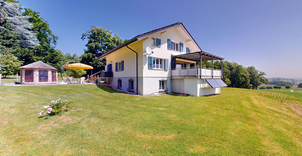 Construite en 2005 sur deux parcelles totalisant 5'166 m² (2'317 m² et 2'849 m²), la propriété se distingue par ses volumes généreux, sa configuration fonctionnelle et son excellent état d’entretien. Répartie sur trois niveaux, elle offre une surface habitable nette d’environ 168 m². Le rez-de-chaussée accueille une chambre, une salle de bain avec WC, une cuisine rénovée en 2022 avec des appareils électroménagers de qualité, ainsi qu’un vaste séjour lumineux avec cheminée. Celui-ci s’ouvre sur une superbe terrasse couverte de 27 m², équipée d’un store électrique, idéale pour profiter de l’extérieur tout au long de l’année.